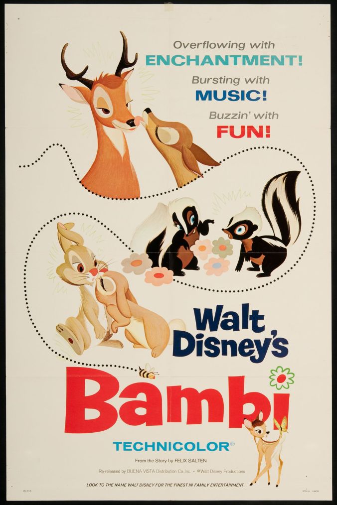 Two years in the life of the mule deer Bambi, from birth, through adolescence with his friends Thumper and Flower, the death of his mother to human hunters, young love, and eventually a great forest fire and the birth of his own children.