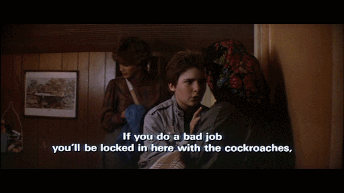 There’s also Corey Feldman’s character Mouth, whose antics were meant to be funny (and probably still are to a lot of people) but come off as crass and dickish to me as an adult viewer. These include fat-shaming Chunk into performing a humiliating dance when he first shows up at the house, and a scene where he takes advantage of the fact that he’s the only one in the house who speaks Spanish. Mrs. Walsh has hired a new Latina cleaning lady who doesn’t speak much English, and he deliberately mistranslates everything that Mrs. Walsh says to her to make it sound more shocking and obscene.