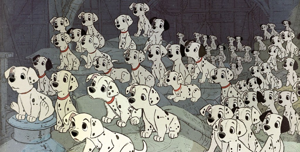 Pongo is a rather bored Dalmatian living in a London apartment with his human, a struggling songwriter named Roger. To alleviate the boredom, Pongo attempts to find mates for the both of them, and succeeds: soon Roger is married to Anita, and Pongo is expecting puppies with Perdita. The night that Perdita gives birth (to a litter of 15), Anita’s old college roommate Cruella De Vil shows up, demanding to buy the entire litter. Roger and Anita refuse, and Cruella leaves angrily.