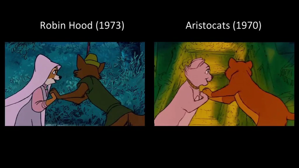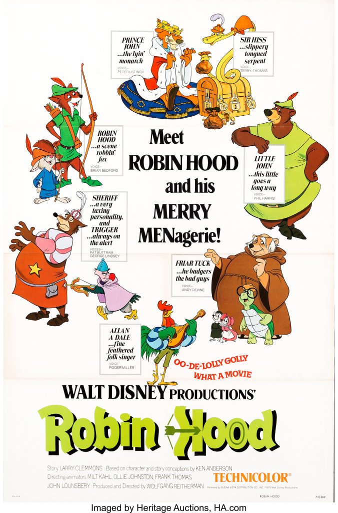 Flash forward to 1970, while The Aristocats is in production. Executives at Disney were pushing for another adaptation of a classic tale, more in the vein of Sword in the Stone than the comparatively contemporary Aristocats. Disney writer Ken Anderson got the idea to combine Robin Hood (the sort of classic tale that they’d been looking for) with the anthropomorphic animals of the Reynard tales. His conception was quite different from the final product, however. He’d wanted to set the story in America, and use non-stereotypical casting like having a goat Sheriff. Director Wolfgang Reitherman nixed all of that, however, preferring a more traditional take on the material. He’s also the one who took out all the rest of the Merry Men. He’d recently seen Butch Cassidy & the Sundance Kid, and wanted a Paul Newman/Robert Redford-esque duo dynamic.