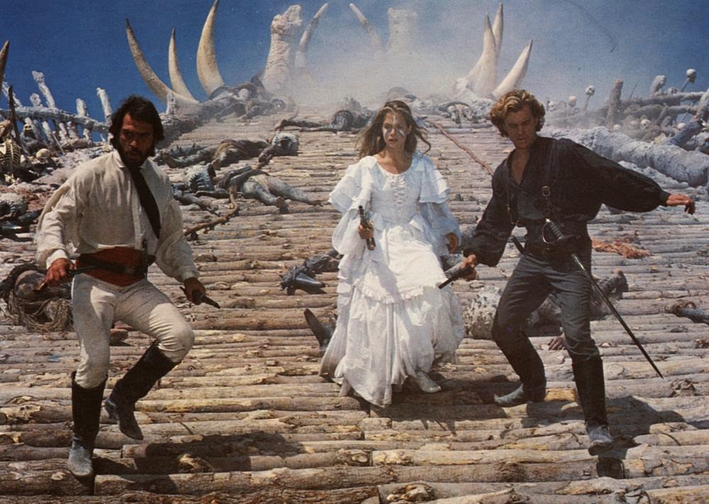 Speaking of which, while this movie fails at being an Indiana Jones ripoff, it actually manages to play like a Pirates of the Caribbean ripoff instead, albeit one that came out twenty years before the movie it’s copying. It’s got almost the exact same plot structure: a naïve young man has to team up with an older, more worldly pirate to rescue his loved one from the pirate’s sworn rival. The young man is initially hostile to pirates, but after several adventures with his impromptu mentor, including a visit to a rowdy pirate port, he ends up becoming one himself. At the end, the pirate is captured by the authorities, but is rescued from his execution by the young man, now very much a swashbuckler himself.