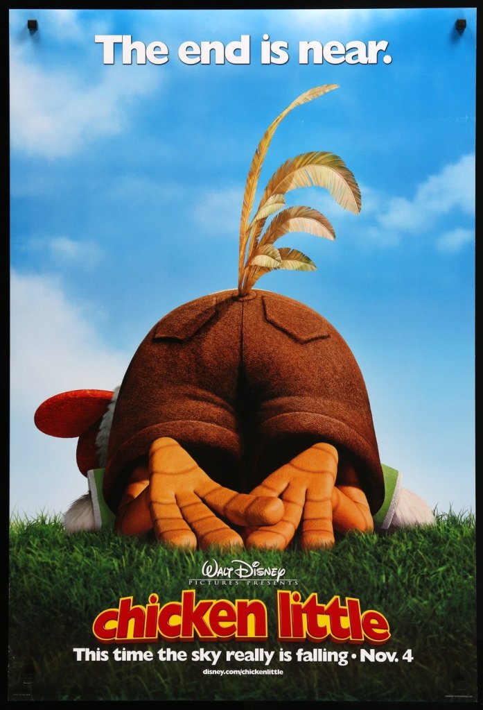 Chicken Little, a diminutive chicken in the town of Oakey Oaks, begins to ring the town bell, screaming for everyone to flee for their lives. After a significant number of injuries and property damage is caused by the ensuing panic, Chicken Little calms down enough to tell everyone that the “sky” was falling and had hit him on the head. His father, Buck, convinces everyone that it had only been an acorn, making Chicken Little a pariah among the townsfolk (there’s even a movie made about it).